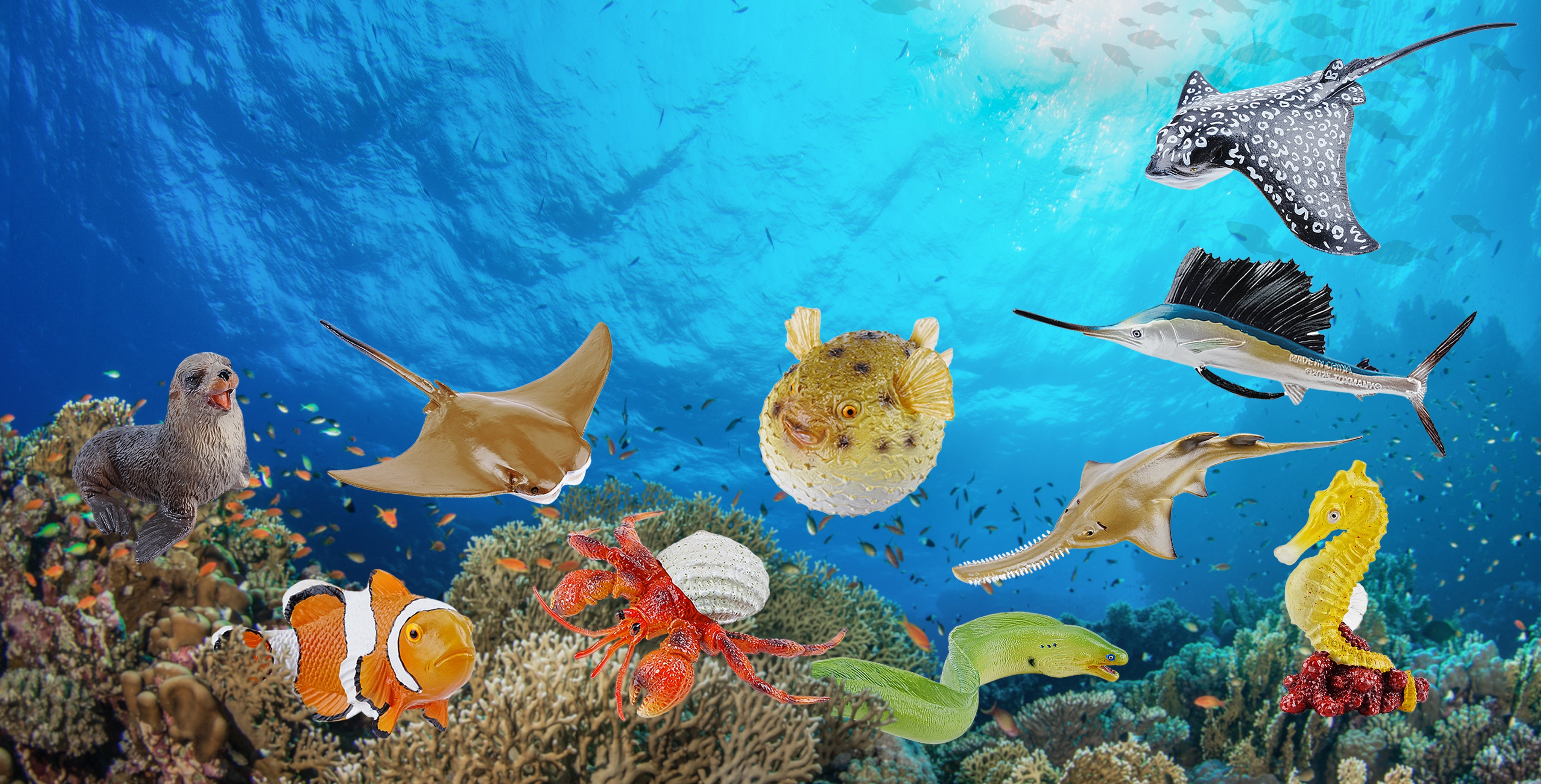 1 Fur Seal, 1 Pufferfish, 1 Green Moray Eel, 1 Cownose Ray, 1 Spotted Eagle Ray, 1 Clownfish, 1 Sailfish, 1 Seahorse, 1 Hermit Crab, 1 Dolphin Calf, 1 Beluga Whale Calf, 1 Orca Calf, 1 Smalltooth Sawfish Pup, 1 Blotched Fantail Ray, 1 Bowmouth Guitarfish, 1 Manta Ray