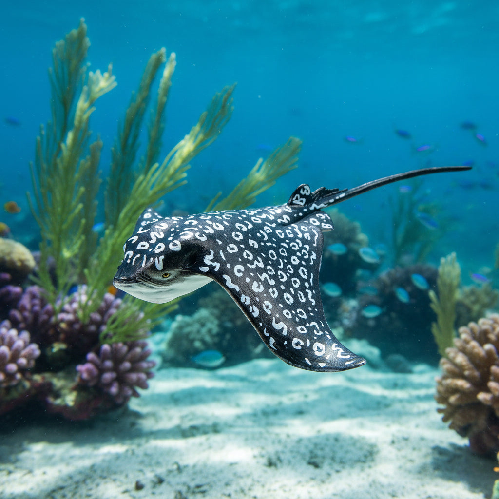 The Spotted Eagle Ray is known for its elegant swimming style, often gliding close to the surface or performing dramatic leaps from the water.