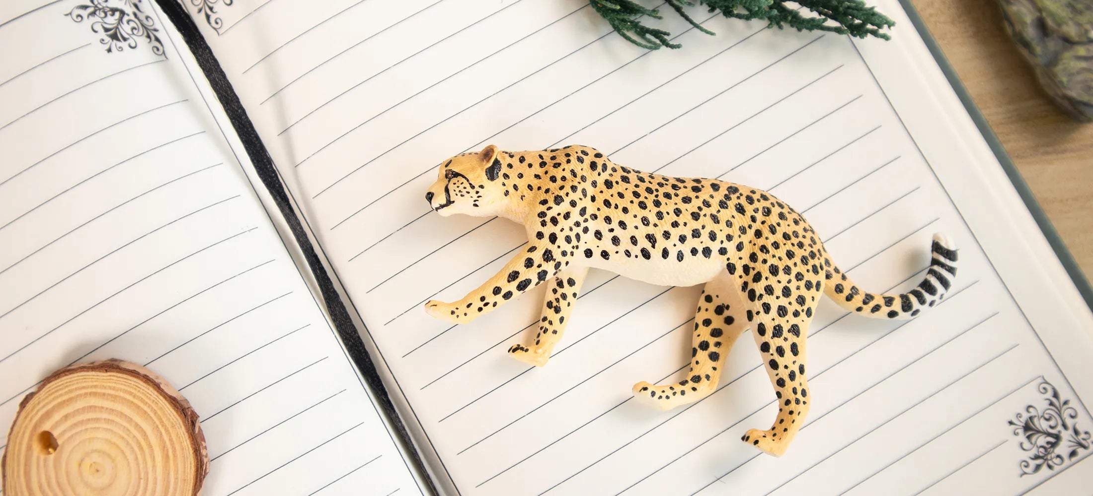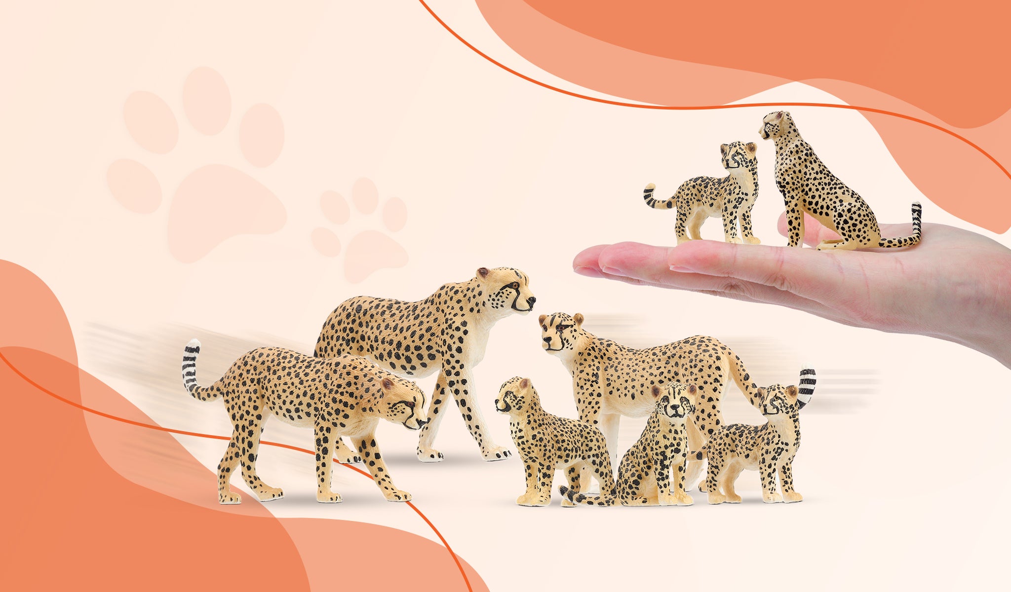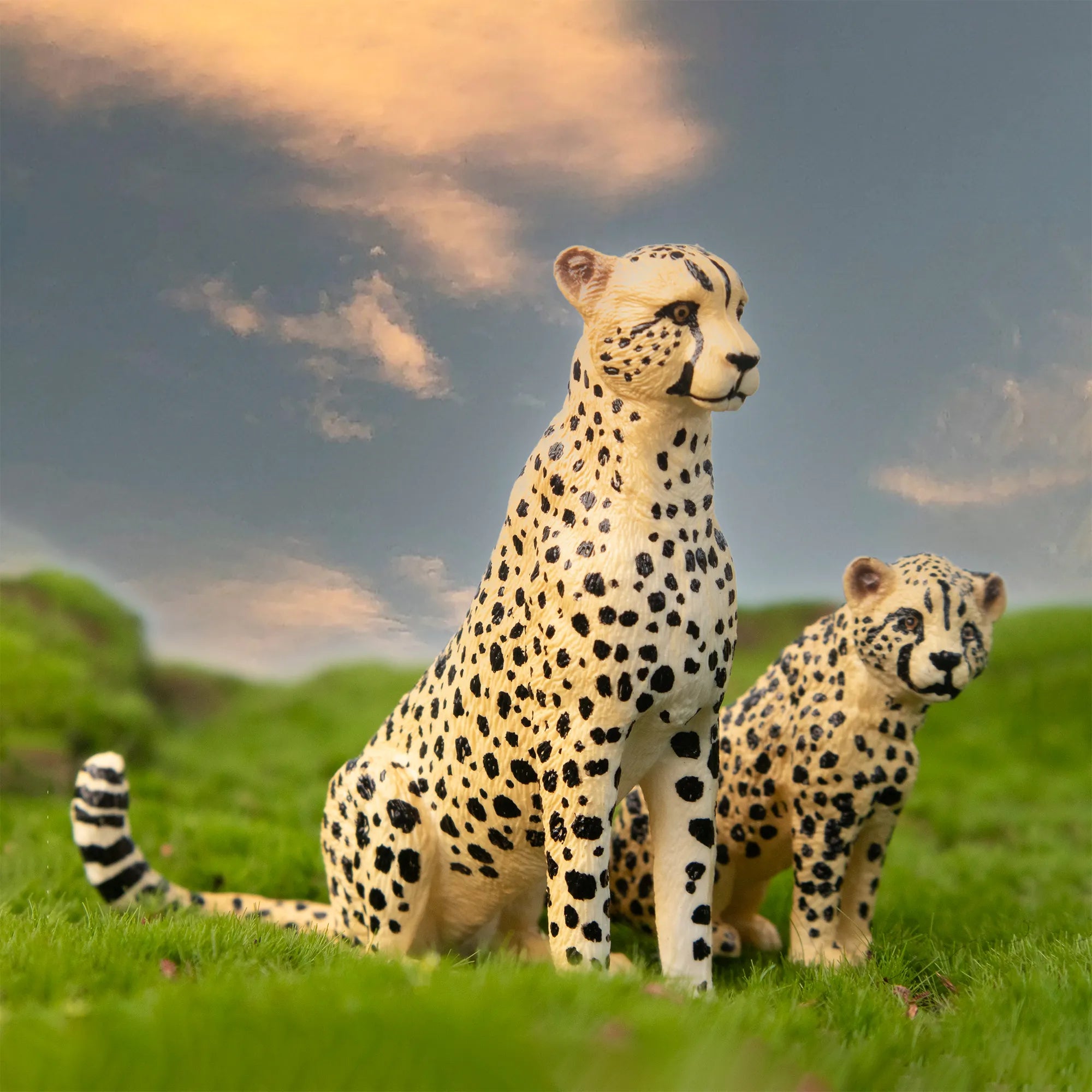 2 guepardos machos, 1 guepardo hembra sentada, 1 guepardo hembra caminando, 1 cachorro de guepardo de pie, 1 cachorro de guepardo sentado, 2 cachorros de guepardo mirando de lado (idénticos)