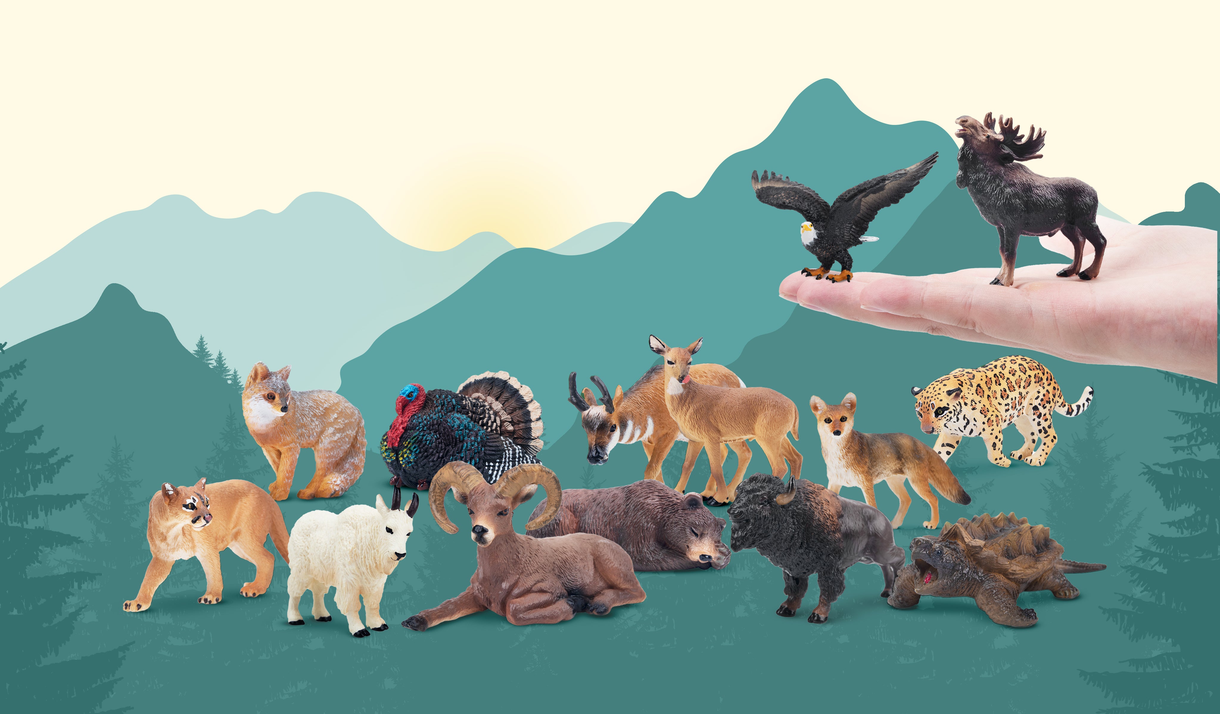 1 ours brun, 1 pygargue à tête blanche, 1 bison d’Amérique, 1 antilope pronghorn, 1 orignal, 1 couguar, 1 coyote, 1 cerf de Virginie, 1 dinde sauvage, 1 tortue alligator, 1 renard gris, 1 chèvre des montagnes, 1 mouflon d’Amérique, 1 jaguar