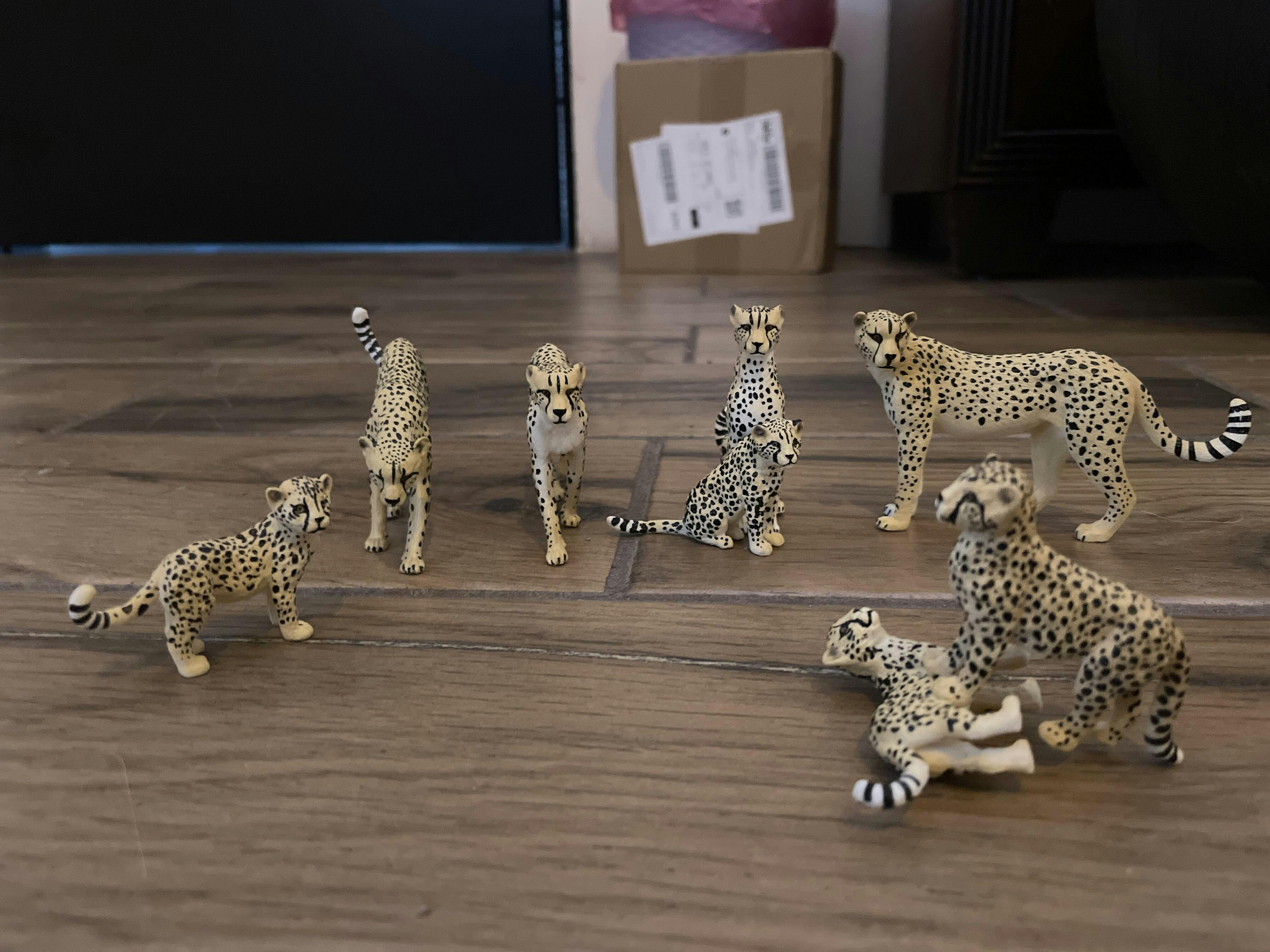 Explore the wild beauty of cheetahs with this detailed 7-piece cheetah family figurine set, perfect for play and learning.